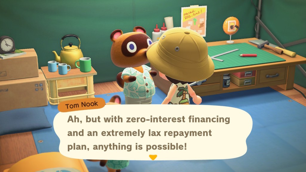 You see, when Tom Nook gives you that mortgage, he never actually requires you to pay it back. There’s no interest, no due dates or deadlines. The only reason to pay it off — as well as all the subsequent debts you can acquire from him — is to eventually be able to build a bigger house.