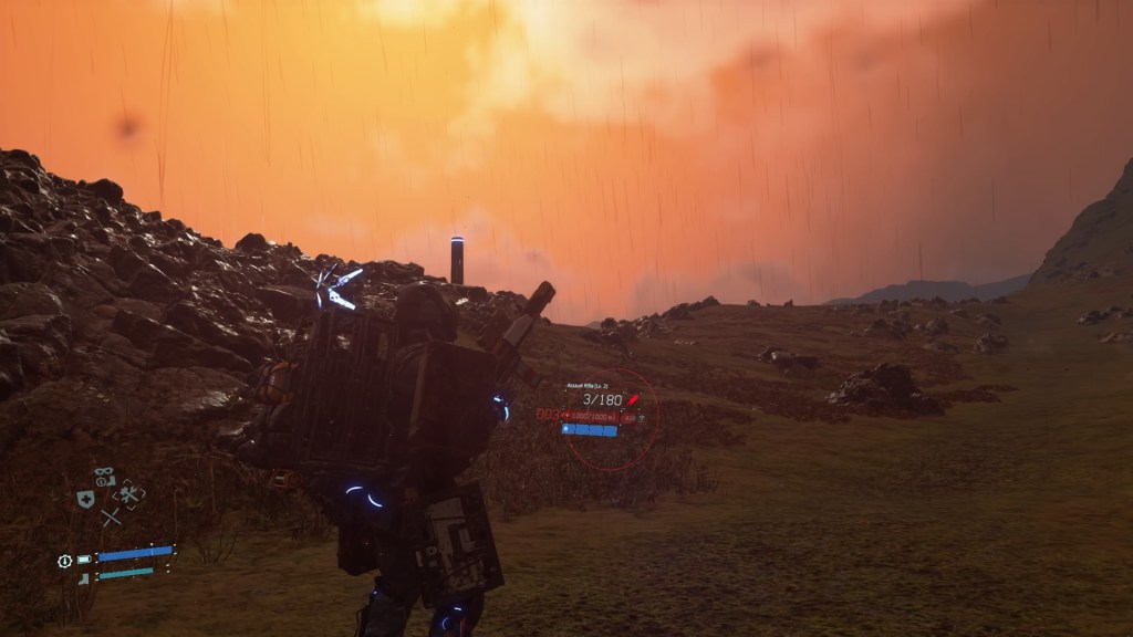 Death Stranding, on the other hand, is — in fact — a walking simulator. The game places the minutae of traversal at its very center: over different types of terrains, up mountains and down rocky crags, through rivers and around lakes, through snow and sludge. Sam Porter Bridges, as his name so directly suggests, is a courier who builds his bridges and roads and zip-lines with the help of a vast multiverse of other Sam Porter Bridgeses. Traversing what, exactly? Well, a postapocalyptic United States destined for mass extinction, in which a cataclysm has severed the bridge between life and death and “stranded” the dead behind. Ghosts called BTs linger in this world — creatures of antimatter awakened by time-accelerating rain, that catastrophically annihilate at contact with a living being.